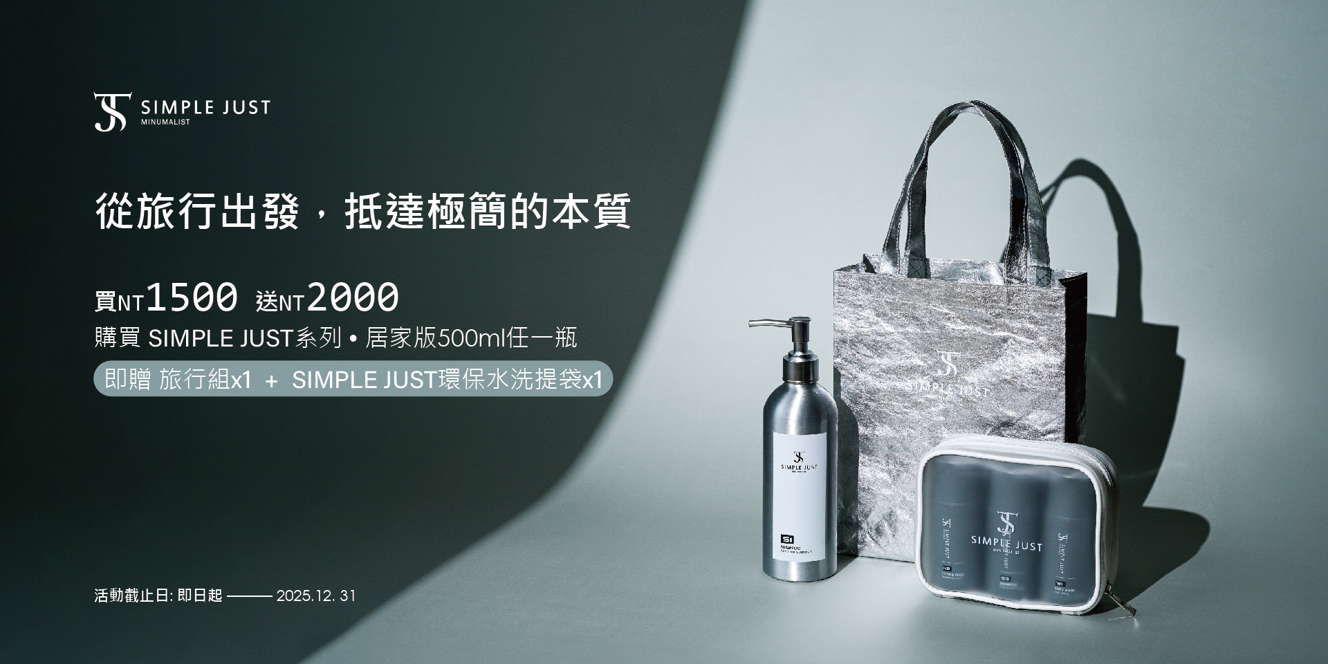 活動詳情 購買 SIMPLE JUST 居家系列500ml任一瓶,即可獲得價值 NT$2000 的旅行組 x1 和環保水洗提袋 x1。